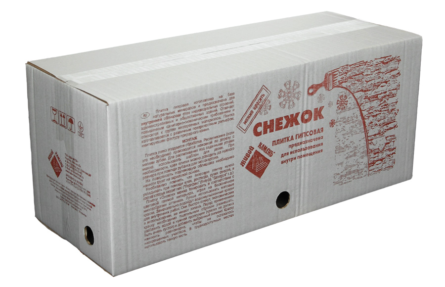 Плитка гіпсова для внутрішніх робіт. Імітує фактуру природного каменю. Плитку «Сніжок» можна тонувати відповідно до кольорової гами інтер'єру. Краще всього використовувати матові фарби. Добре підійдуть водоемульсивні фарби для внутрішніх робіт. Вони швидко сохнуть, економічні у використанні, не мають запаху. Перед використанням фарбу необхідно ретельно розмішати, розвести водою в потрібній пропорції (фарба не повинна бути дуже густою) і додати вибраний пігмент. Фарбу наносити рівномірно, щоб не залишалося непрофарбованих ділянок. У важкодоступних місцях використовувати тонкий пензель. Розмір плитки: